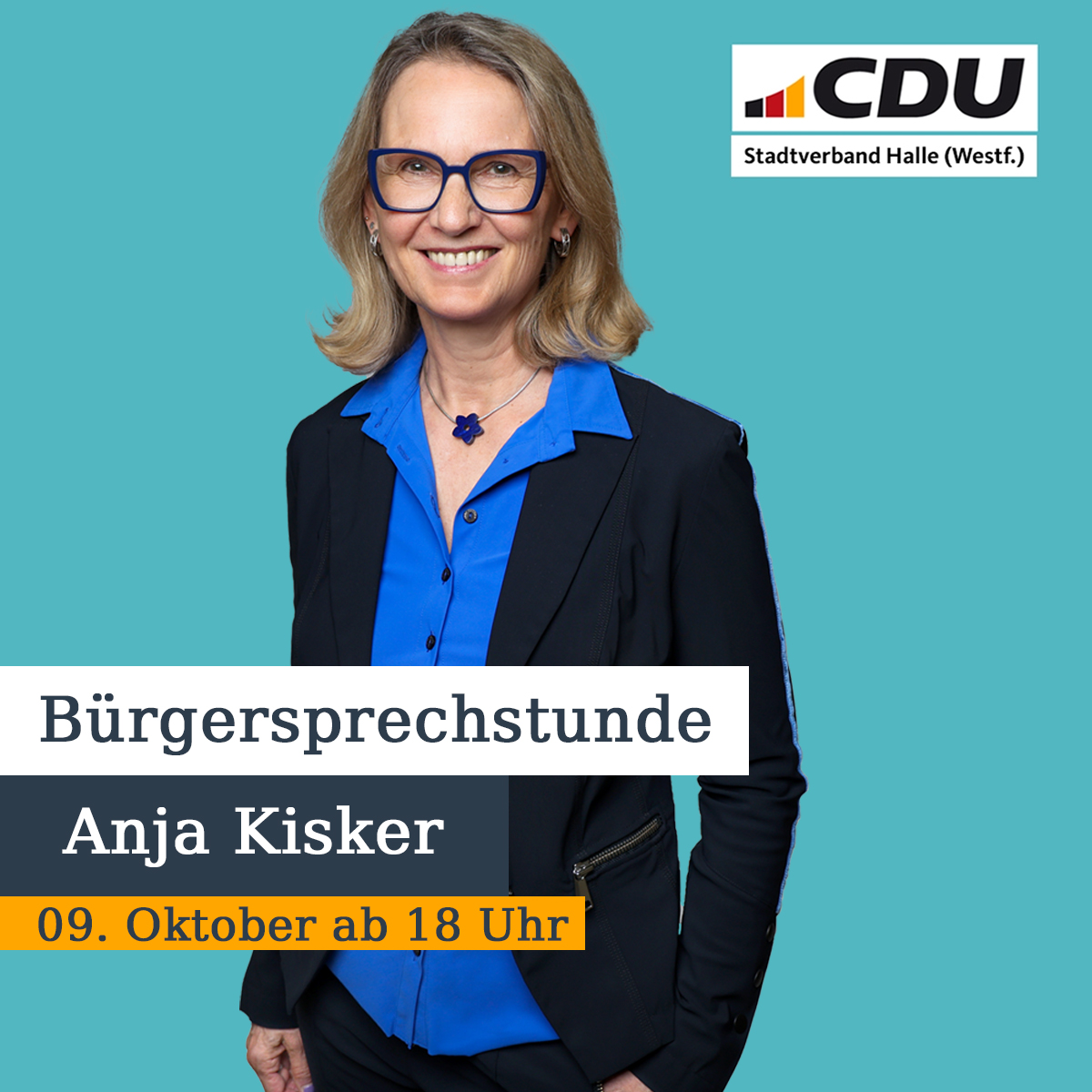 Am 09. Oktober findet die Bürgersprechstunde mit der Mitgliederbeauftragten des Stadtverbandes der CDU Halle (Westf.) Frau Anja Kisker statt.