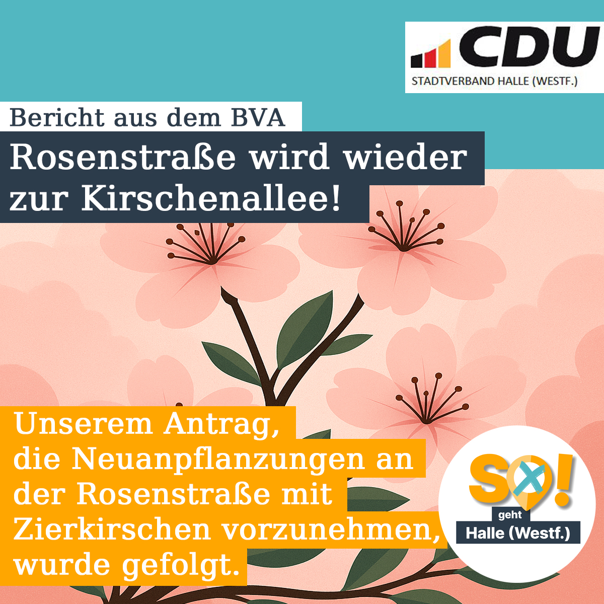Unserem Antrag, die Neuanpflanzungen an der Rosenstraße mit Zierkirschen vorzunehmen, wurde gefolgt.